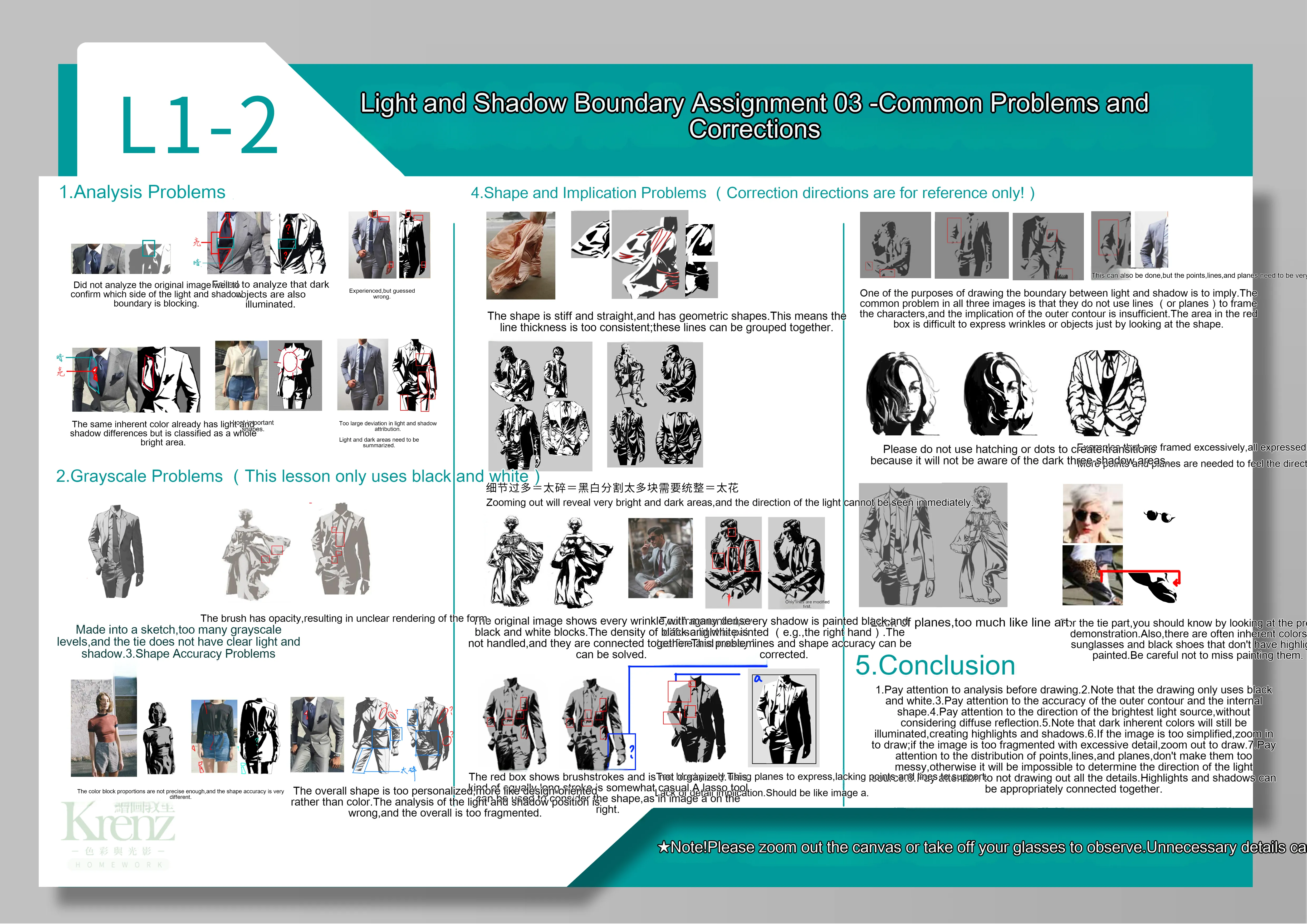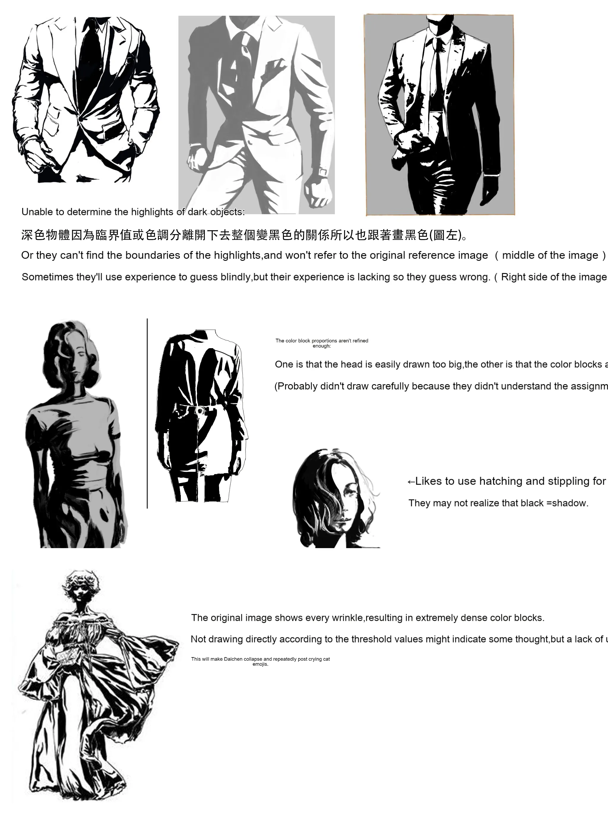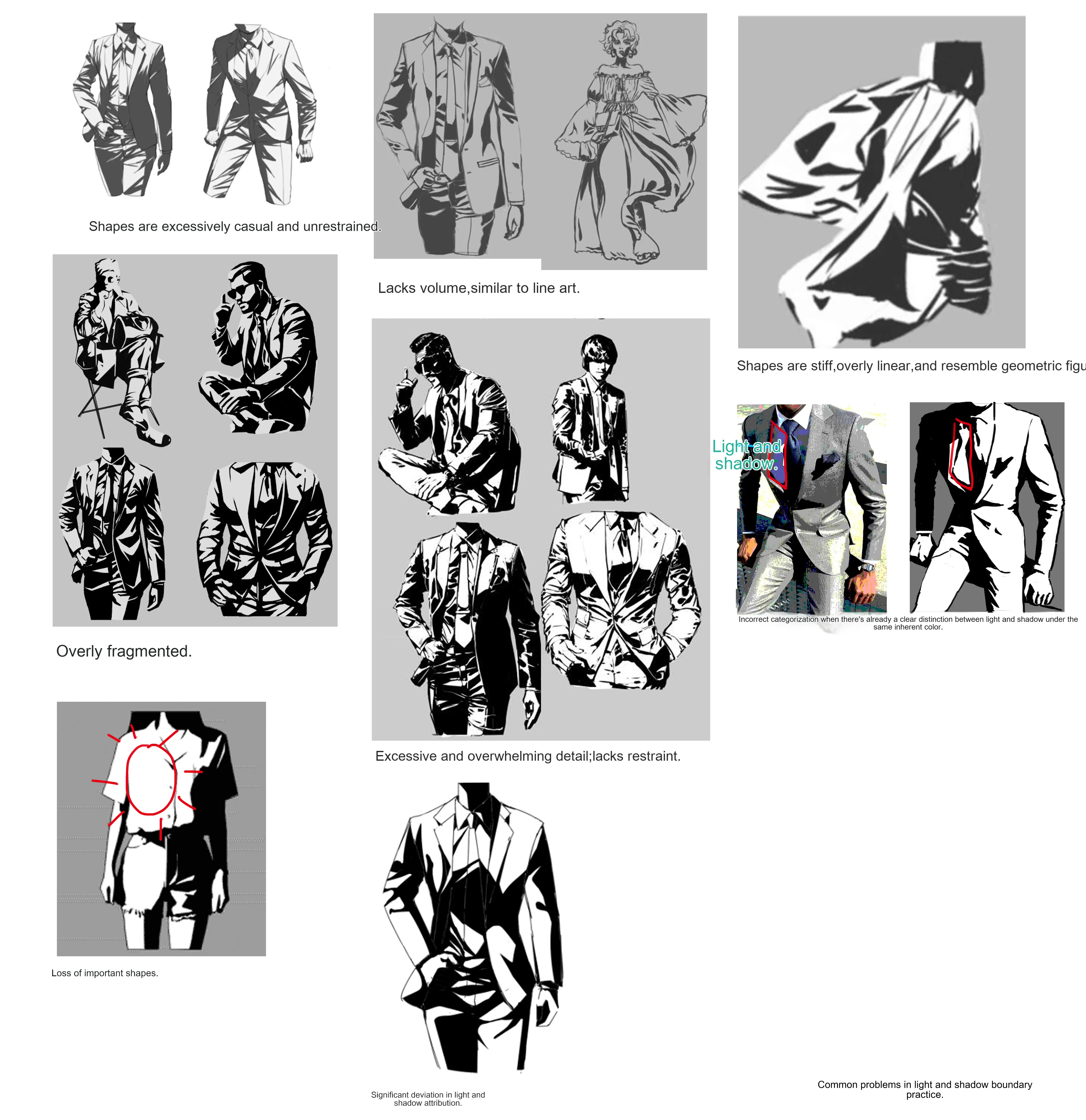 Lots of text overlap here. Mainly commenting about combining shapes into blocks, grouping, and finer detail control of lines that carve into these shapes. Don’t make the blocks too uniform, but don’t overuse lines. Figure a in the bottom middle depicts a proper balance.